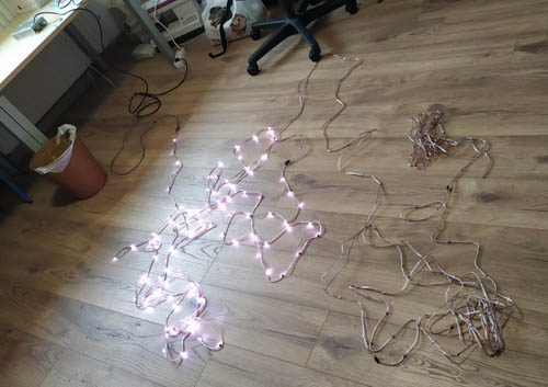 Van Jurgen had ik een Arduino-controller gekregen die hij nog op voorraad had (na poging twee; de eerste zending raakte kwijt in de post :’-) ). Maar toen ik er een scriptje naar uploadde, werkte het niet goed: wat ik ook probeerde, hij wilde maximaal 109 van de 250 ledjes aansturen. Dat bleek na een hoop frustratie niet aan mijn programmeervaardigheden te liggen, maar een beperking van de capaciteit van de controller te zijn. Oh. Jurgen had er nog nooit meer dan 100 lampjes op aangesloten, dus daar had hij niet bij stil gestaan. (Want natuurlijk, ik kan ook nooit met iets kleins beginnen om het stapsgewijs te leren – ik moet het meteen overmatig groots aanpakken. *zucht*)