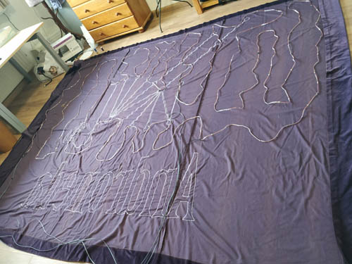 Het oorspronkelijke plan was om ledjes te gebruiken die speciaal gemaakt zijn om in kleding (dus stof) te naaien en te verbinden met geleidend garen. Wat een gaaf spul!!! Ik werd helemaal happy van alle mogelijkheden die er waren. Maar 120 van die programmeerbare exemplaren werd wel héél erg prijzig. Het tweede plan, om gewone losse ledjes in het doek te naaien strandde ook, omdat 120 lampjes niet zomaar in serie te schakelen zijn op een lage voedingsspanning. En als je heel veel parallelle clusters ledjes maakt, wordt het een flinke uitdaging om al die stroomdraden in de stof elkaar niet te laten kruisen.