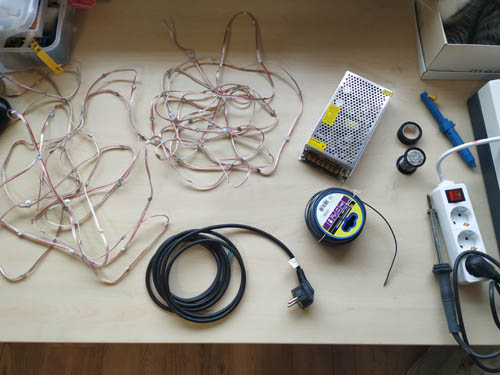 Wonder boven wonder was alles ruim op tijd binnen en zag het er naar uit dat ik nog voor ons optreden in januari de boel klaar kon hebben. Dacht ik optimistisch. Want al snel bleek dat ik te weinig ledstrips had besteld. Drie strips zijn 150 ledjes, dus in theorie genoeg, maar doordat ze nogal dicht op elkaar zaten, had ik 5 strips nodig om het doek helemaal te kunnen bedekken. Dus nogmaals een bestelling geplaatst via Aliexpress en nogmaals gewacht.