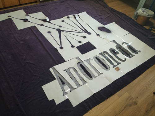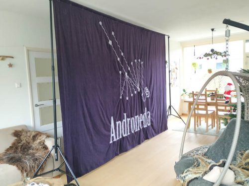 Dus deed ik mijn bandgenootjes een offer they couldn’t refuse (hoopte ik): zij hoefden alleen bij te dragen aan de kosten van het statief dat nodig was om het doek aan op te hangen; het doek zou ik geheel zelf maken en financieren. Ik kon het immers afdoen als ‘hobby, dus mag geld kosten’. Om het plan tastbaarder en visueel te maken kocht ik via Marktplaats alvast een groot paars gordijn van 3,5 bij 2,5 meter en stalde dat uit op de vloer tijdens een van onze repetities. En waarempel: ze gingen akkoord!