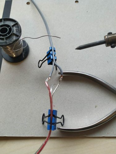Lo and behold: die arriveerde ontzettend snel! Dus kon ik eindelijk de voeding, alle ledstrips en de Arduino-controller aan elkaar solderen. Niet dat ik heel erg goed kan solderen… ik heb bovendien alleen een brakke soldeerbout liggen die ik ooit van mijn middelbareschoolvriendje kreeg. Dus tapete ik de kabeluiteinden ook maar goed vast.
