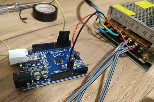 Scriptje opnieuw geupload. De lampjes deden het!! …Totdat ik de kabel naar de pc ontkoppelde en de voeding aansloot. Hij werkte alleen op USB-voeding, niet de losse voeding. Wut?? Alle kabels vervangen om te kijken of het een kabelbreuk was. Geen effect. Weer helpdesk Jurgen geappt. Oh wacht, waarschijnlijk was dit een afwijkend model controller en moest het kabeltje voor de plus in een ander gat. Kabel weer omgezet. Yes, we hebben stroom!!