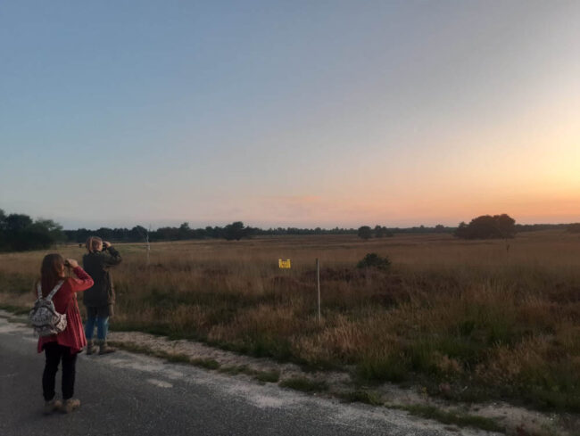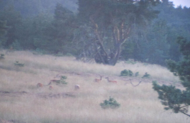 Het is natuurlijk altijd maar de vraag of je iets gaat zien of horen, maar we hadden behoorlijk geluk! Bij een wildscherm zagen we een familie zwijntjes scharrelen. En later op de avond spotten we een kudde hindes met één enorm mannetje met bijbehorend enorm gewei, dat ijverig tussen hen heen en weer aan het rennen was om indruk te maken. Burlgeluiden hebben we helaas niet gehoord, maar het was ook erg mooi om ze gewoon op de hei te zien.