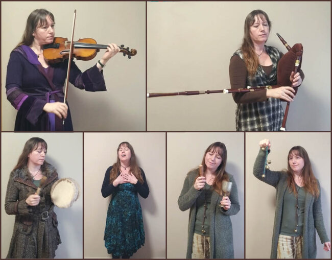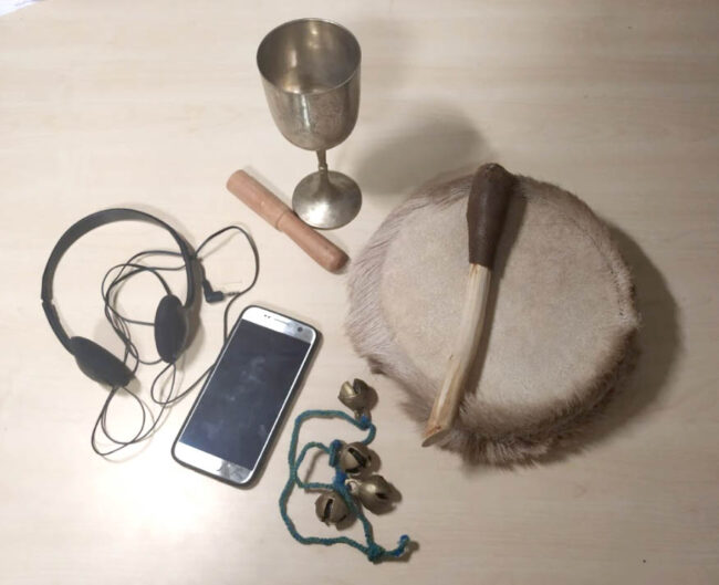 • Ik had ook geen andere ondersteunende instrumenten. (Oplossing: improviseren met wat middeleeuwse belletjes, een beker uit mijn LARP-kist en de sjamanentrom die we met de Heksengodinnen maakten.)