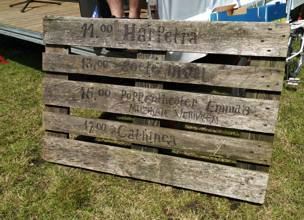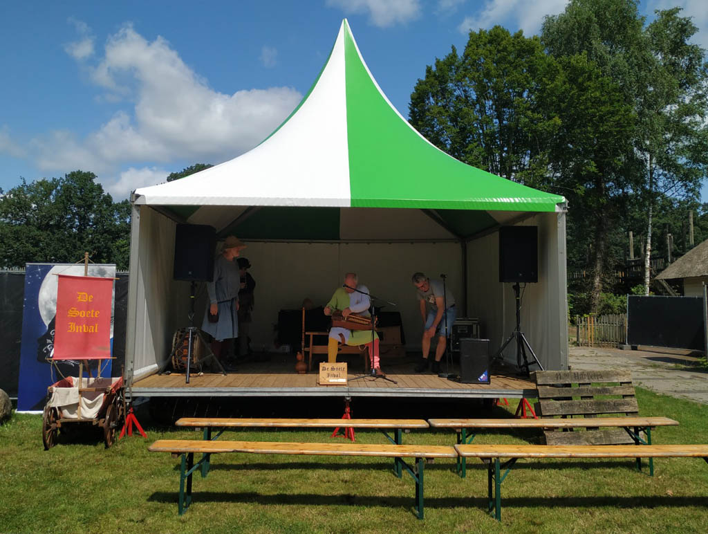 De bezoekersaantallen waren logischerwijs wel wat lager dan tijdens de eerste editie. Normaal gesproken is de zaterdag minder druk dan de zondag (respectievelijk typische festivalgangers versus dagjesmensen), maar nu was het andersom, dus ik denk dat veel dagjesmensen voor de zekerheid toch maar voor een ander uitje hebben gekozen. Hopelijk is de organisatie wel uit de kosten gekomen. Als muziekgroep worden we gewoon betaald door de organisatie, maar ik kan me voorstellen dat de standhouders wat minder blij waren. Voor ons was het enkel jammer dat er maar weinig luisteraars waren toen we op het podium stonden (waar we 1x per dag waren ingepland; voor de rest speelden we op verschillende plekken op het terrein). Dat kwam niet alleen door de lage opkomst vermoed ik, maar ook doordat de verplichte bankjes in de felle zon stonden. Ik zou daar zelf ook niet op zijn gaan zitten… in de schaduw van het podium liep het zweet al in straaltjes langs mijn benen. :-X