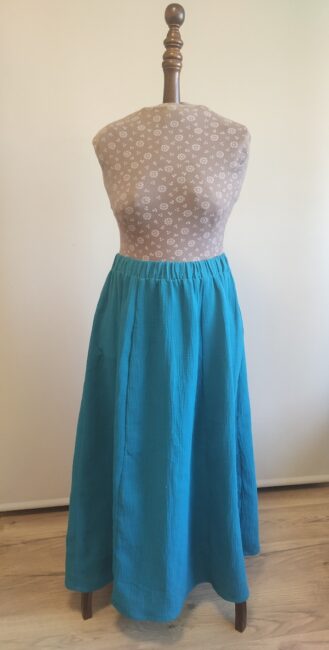Ik wilde deze rok eigenlijk van een heel dun stofje maken, zodat hij mooi ‘flowy’ zou vallen. Helaas hadden ze in de stoffenwinkel niet zo’n stof in de kleur die ik wilde. Dus koos ik toch maar voor een iets dikkere stof. Dat had ik beter niet kunnen doen, want hij valt nu inderdaad nogal saai naar beneden.