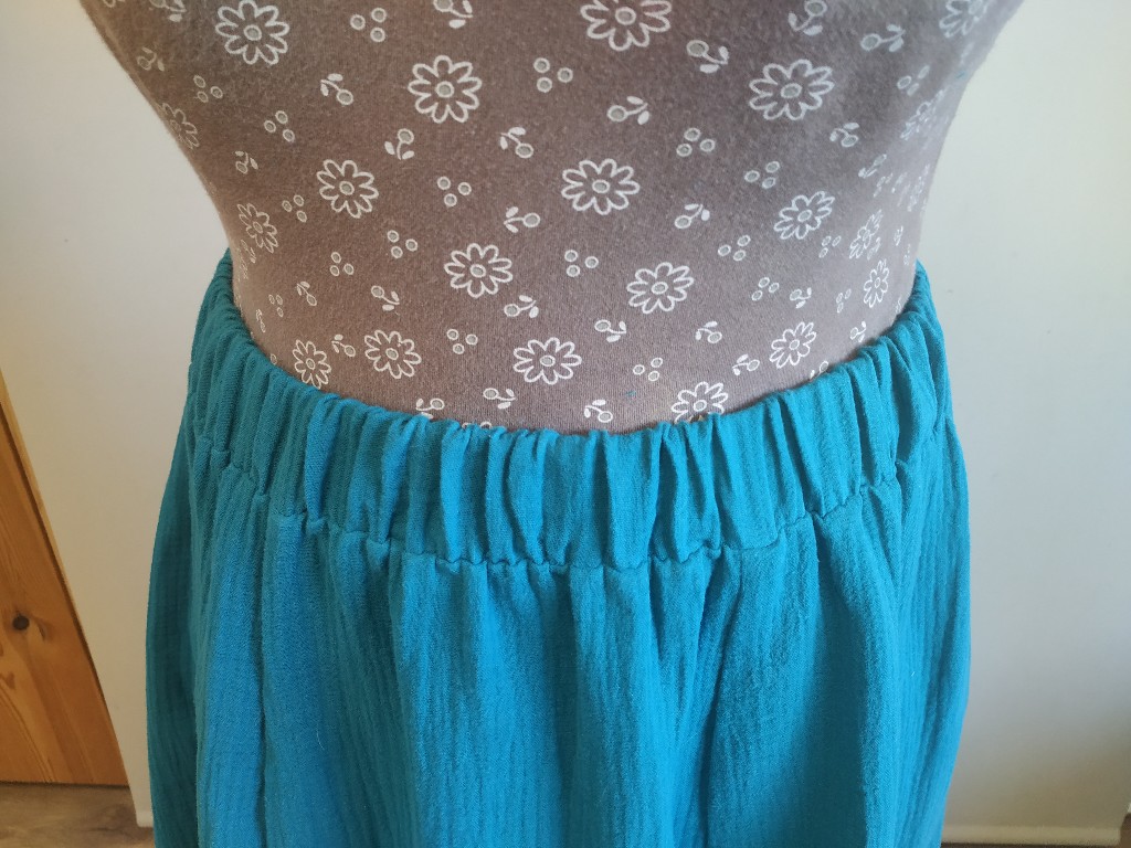 Omdat ik al vaker een tunneltje met elastiek als tailleband had gemaakt, wilde ik nu oefenen met het in de band vaststikken van het elastiek. Had ik ook beter niet kunnen doen, want doordat de stof dan opfrot, wordt de tailleband onnodig dik en dat staat niet elegant.