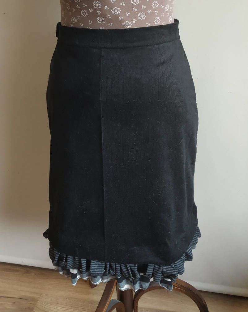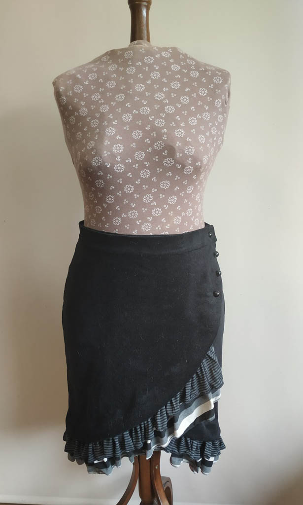 Resultaat: een rare combi van een truttige kokerrok en flamenco-wikkelrok. :-X