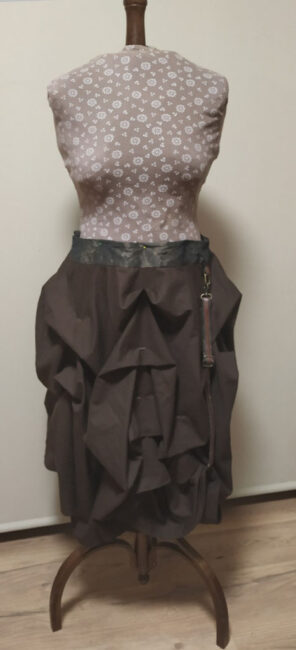 Ik had de perfecte stof nog in mijn kast liggen, maar omdat ik vermoedde dat dit een cirkelrok was, had ik daar niet genoeg (4 meter!) voor in huis en moest ik toch iets nieuws kopen. Leer had ik wel nog: ooit kreeg ik van mijn doedelzakbouwer wat reststukken, die hier prima voor geschikt waren. Ook vond ik in mijn ‘je weet nooit waar dit handig voor is’-doos twee karabijnhaakjes in de juiste kleur. Ma leverde zelf wat van een handtas afgeknipte stukken leer aan – die bleken te kort en niet de juiste bruintint te hebben om in de rok te verwerken, maar ik kon er wel de metalen stukjes vanaf slopen en recyclen.