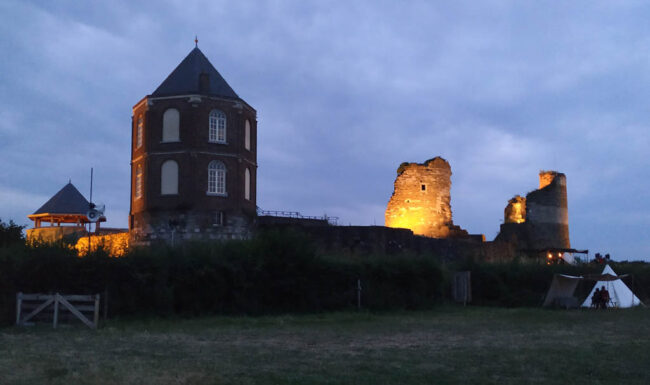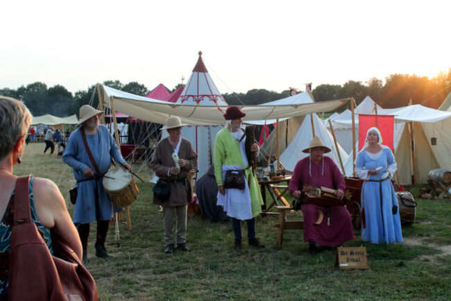 Ook overdag waren we blijkbaar veel actiever dan de meesten verwachtten, want we hebben van zeker drie mede-deelnemers een opmerking gekregen in de trant van “Jee, wat zijn jullie fanatiek!” Mjah, ik voel me toch verantwoordelijk om te doen waar we voor zijn ingehuurd. Maar we hadden inderdaad misschien iets minder vaak mogen spelen… Gelukkig waren er een paar gedwongen pauzemomenten, want als er een veldslag-demonstratie was, stond de omroepinstallatie zo hard dat het storend voor ons was om tegelijkertijd te spelen.