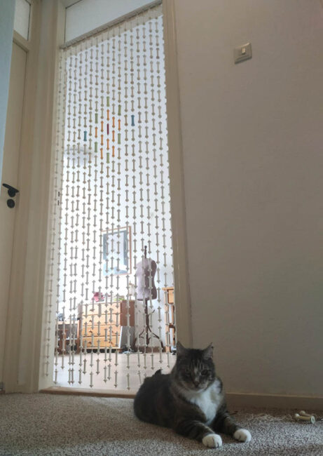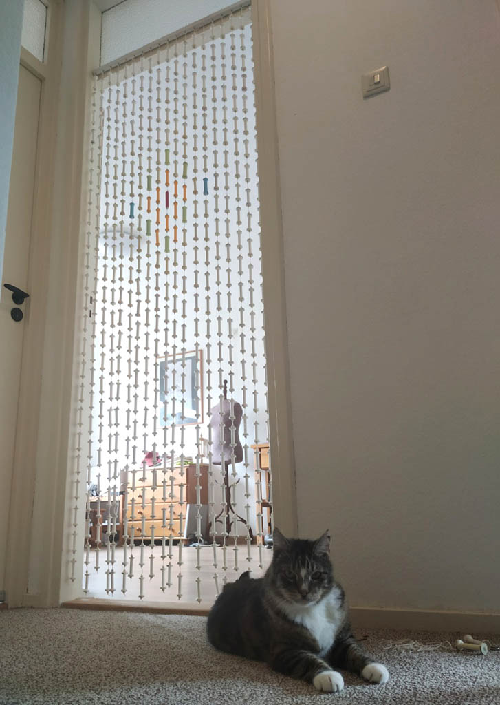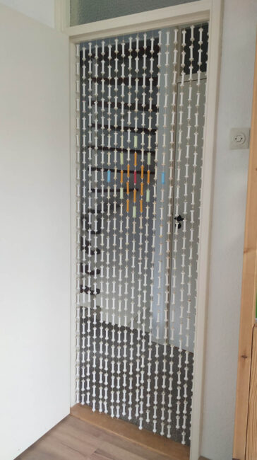 Oftewel: ik verklaar het vliegengordijn hierbij ‘goed genoeg’. Nu is het ding tenminste voor het eind van de zomer klaar, zodat ik hem in de deuropening van mijn hobbykamer kan hangen. (In de winter hang ik daar isolerende lamellen.)