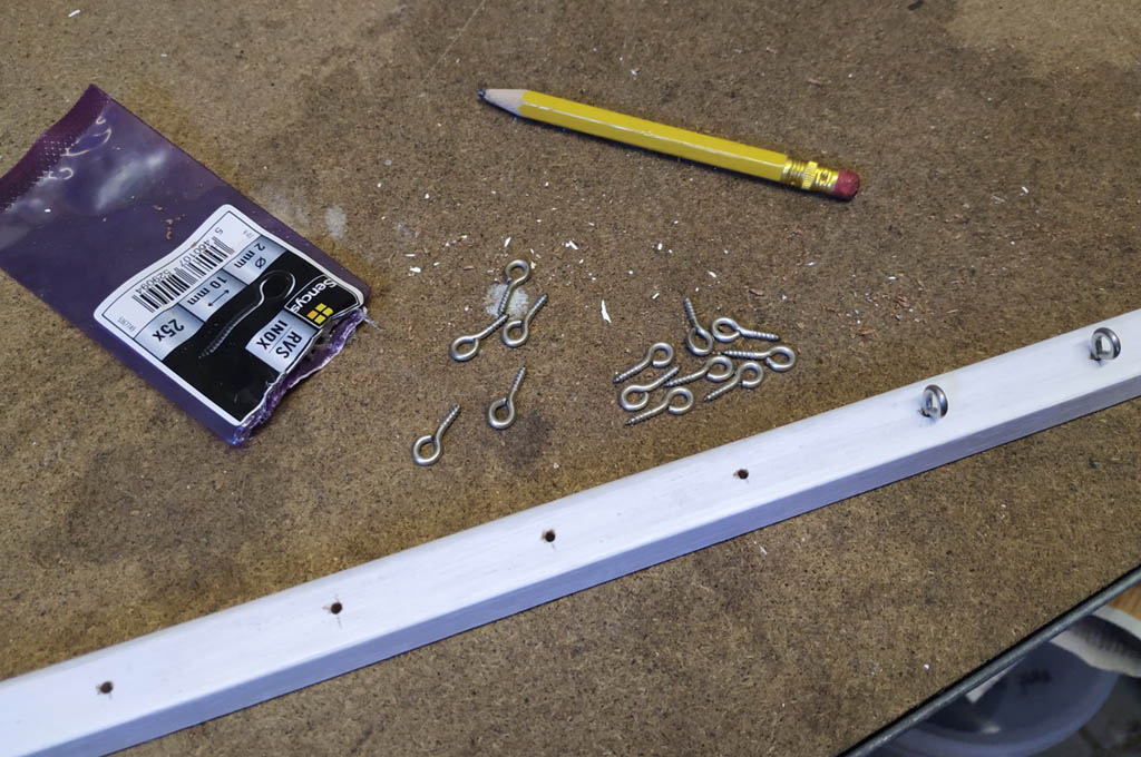 Vervolgens zaagde ik een houten latje (een restant van een ander project dat nog in mijn schuur lag) op maat, schilderde ik het wit en draaide ik er metalen oogjes in.