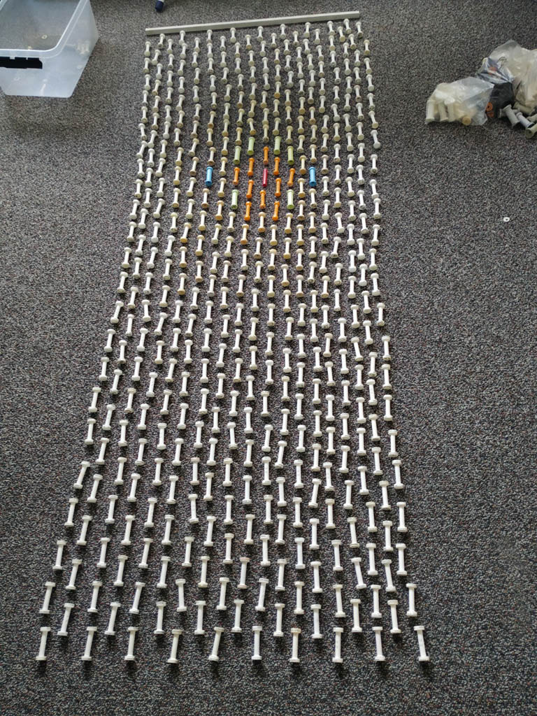 Toegegeven: ik heb veel meer garenklosjes gespaard dan ik nodig had voor het gordijn, maar garenklosjes komen in heel veel verschillende vormen en maten. En ik besefte dat alleen die kleine klosjes gebruiken, het mooiste resultaat zou opleveren. Ik heb nog wat geëxperimenteerd met strengen van ander formaat klosjes aan bv. de zijkanten, of een rijtje grotere klosjes aan de boven- en onderkant, maar koos er uiteindelijk toch voor om alleen de kleintjes te gebruiken. En dus moest ik langer doorsparen.