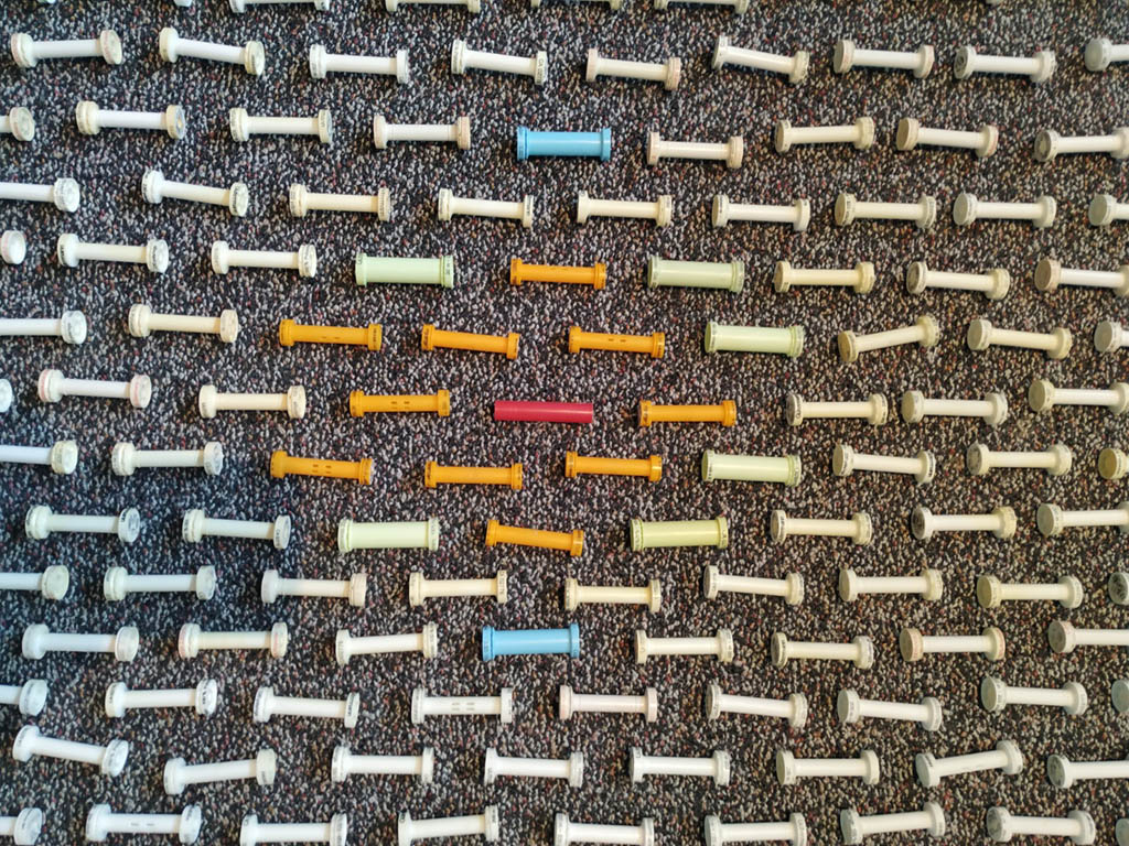 Toen ik er eenmaal genoeg had, legde ik alle klosjes netjes in een mooi patroon neer op mijn zoldervloer (waar ik de deur dicht kon doen als ik er niet was, om te voorkomen dat Sammy er mee los ging). Sommige klosjes waren flink vergeeld en andere een beetje, maar daar heb ik gebruik van gemaakt in het patroon: de meest vergeelde liggen in het midden, zodat je een soort verloopje van gelig naar fel wit krijgt naar de buitenranden toe. (Helaas niet goed te zien op de foto.)