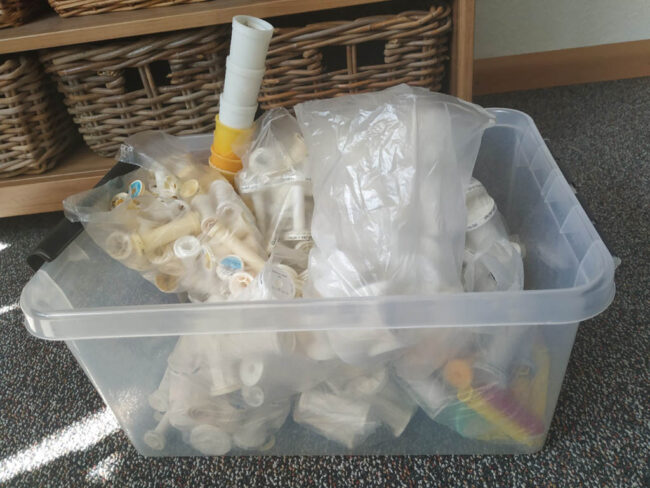 Dus begon ik te sparen. Want het leukste is natuurlijk als je zo’n gordijn maakt van daadwerkelijk gebruikte klosjes; ze ergens kopen doet af aan het concept.
