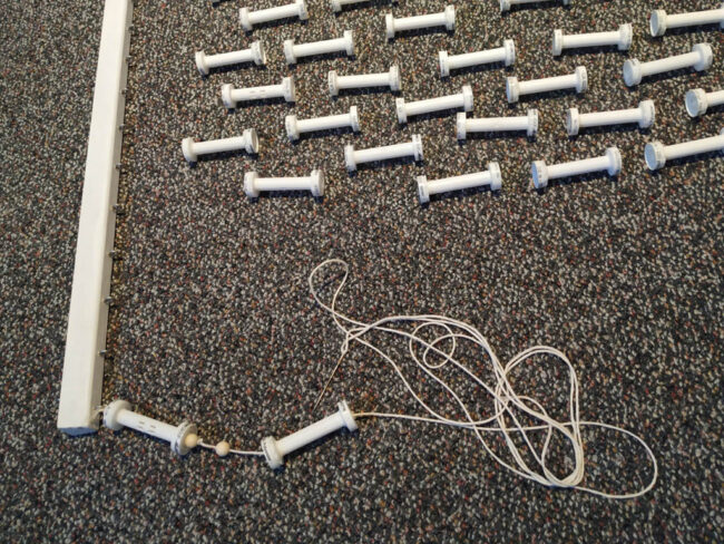 Als ik het nog een keer moest doen, dan zou ik alles erin knopen terwijl het ding al hangt in plaats van liggend op de grond, omdat je dan beter kunt zien of de boel recht hangt ten opzichte van elkaar. (Ergonomisch maakt het niet uit – dingen erin knopen terwijl de koorden hangen is weer slecht voor je schouders in plaats van je rug.)