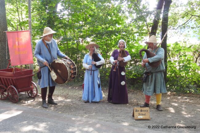 Het was een eindje rijden en het was warm, maar ook superleuk. Er werd veel geluisterd naar onze muziek en de sfeer was heel prettig. Als ik gewoon ergens langs liep, werd er veelvuldig naar me gelachen en ik had continu spontane aanspraak van onbekende mede-deelnemers bij het waterpunt, de toiletten, of waar dan ook. Natuurlijk zagen we ook heel veel oude bekenden terug! Lekker weer socializen met de mensen van onder andere De Graven van Holland en ‘t Vaerdich Volk. En alle andere muzikanten, die in grote getale aanwezig waren!