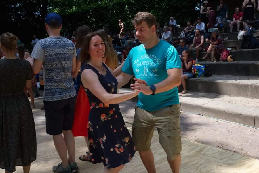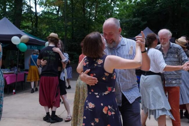Ja, het was warm, maar het is in een openluchttheater (orga: “jullie evenement is altijd het makkelijkst om vrijwilligers voor te vinden” <3 ) en de bomen daar zorgen er altijd voor voldoende schaduw zodat het uit te houden blijft. Alleen de (biologisch afbreekbare – het is wel balfolk) ballonnen hadden het te zwaar: in de volle zon deed de ene na de andere ‘KNAL!’, niet noodzakelijk in het ritme van de muziek, en de ballon die vlak voor een microfoon sprong, was bijzonder pijnlijk voor de oren. ![]()