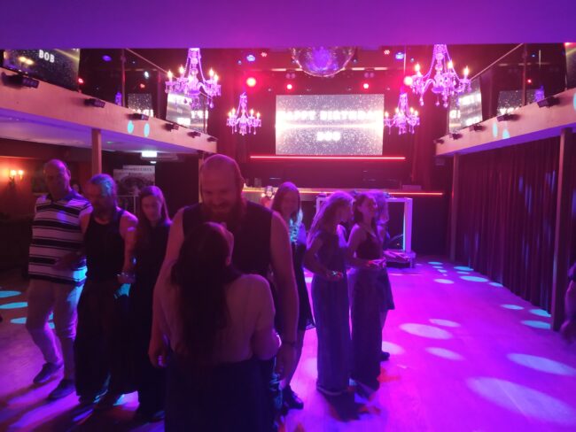 Het concept van het verjaardagsfeest was dat eerst live een set balfolkmuziek zou worden gespeeld en daarna een DJ een set zou draaien van salsa/zouk/bachata/merenge, want Bob doet nogal veel verschillende dansen en heeft dus ook uit al die hoeken vrienden. Dat betekende dat ik maar een klein deel van de genodigden kende. De avond begon wat lastig, want zelfs door diverse balfolkers werd ik enkele keren afgewezen toen ik om een dansje vroeg, maar gelukkig laat ik me daardoor niet uit het veld slaan en stond ik lekker toch bijna full-time op de dansvloer. Zelf kunnen leiden biedt extra opties.