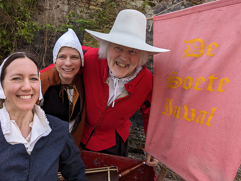 De Soete Inval had al meermaals op dit evenement mogen spelen maar ik was voor het eerst mee, dus ik keek mijn ogen uit naar onder andere alle volgekalkte ramen. Er waren diverse ‘figuranten’ die bijvoorbeeld met karren met Spaanse koopwaar rondliepen, of als Spaanse soldaten langsmarcheerden (“Boeoeoe!!!”). Natuurijk marcheerden er ook Geuzen rond (“Joehoe!!”). Aan het begin van de dag wapperde er aan de kerktoren nog een Spaanse vlag, aan het eind van de dag was deze vervangen door een Geuzenvlag! ![]()