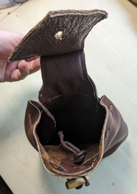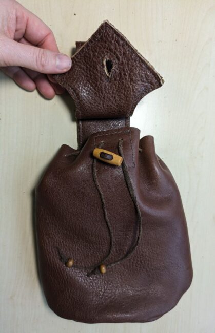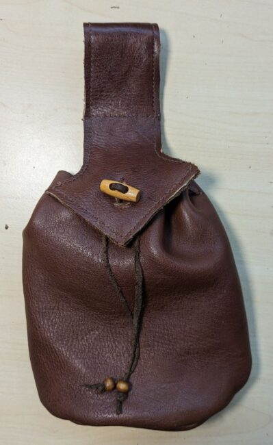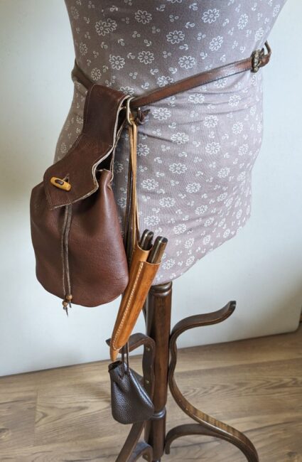 Het tasje is dus niet super historisch correct noch supernetjes gemaakt, maar het was klaar in één ochtendje! En zonder geld uit te geven, want gemaakt met spullen die in nog in huis had: restanten leer die ik ooit kreeg van mijn doedelzakbouwer, kraaltjes die ik ooit ergens vanaf heb gesloopt, en leren veters en leergaren die ik sowieso altijd in de kast heb liggen. Mocht ik te zijner tijd een betere/nettere versie willen, dan kan ik altijd een nieuw exemplaar maken. (Lees: ik zal dit tasje tot het einde der tijden gebruiken