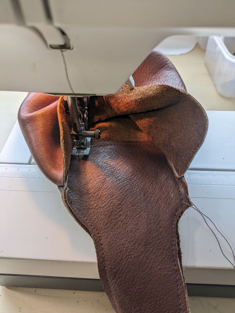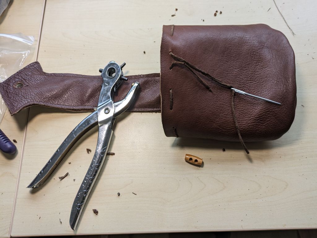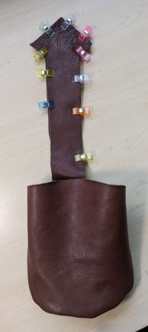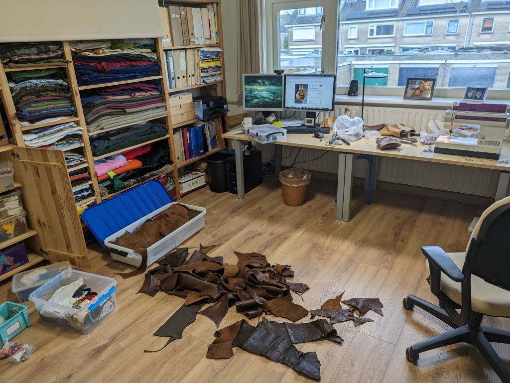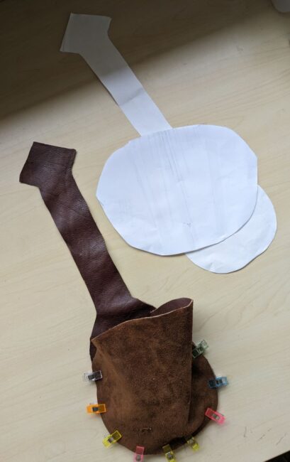 Ik tekende een mal (groot genoeg voor mijn telefoon), gebruikte mijn coupeusekennis om de tekening voor het zakje voorop uit te draaien tot gewenst formaat, en knipte de patroondelen uit leer. Stof had ook gekund denk ik, maar ik had meer zin in met leer werken.