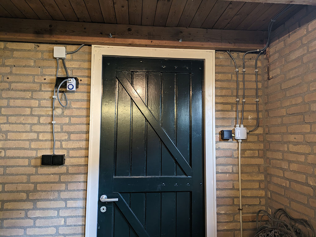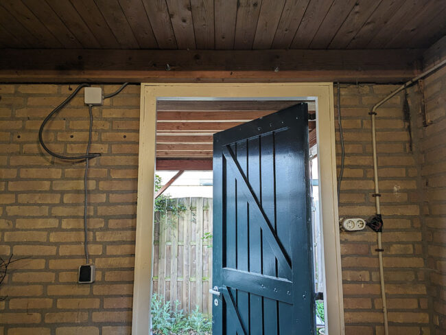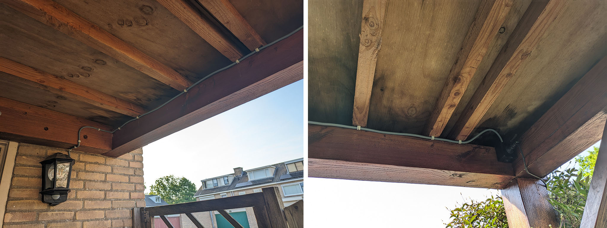 Het is niet overal supermooi geworden (vooral de kabel die langs de overkapping naar buiten loopt – je krijgt kabels nu eenmaal niet in houtkleur en de dwarsbalken zaten te dicht op elkaar om er een boor tussen te krijgen zodat ik de kabels meer naar achteren door de dwarsbalken heen kon trekken, zoals ik binnen heb gedaan), en achteraf zou ik wat dingetjes anders hebben gedaan, maar het is in ieder geval beter dan hoe het was én superpraktisch!