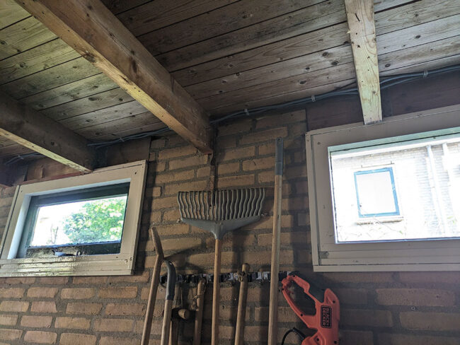 En als ik dan toch de boel aanpakte, kon ik ook gelijk stopcontacten aanleggen aan de andere kant van de schuur, waar mijn werktafel staat. Dat scheelt namelijk steeds klooien met verlengsnoeren.