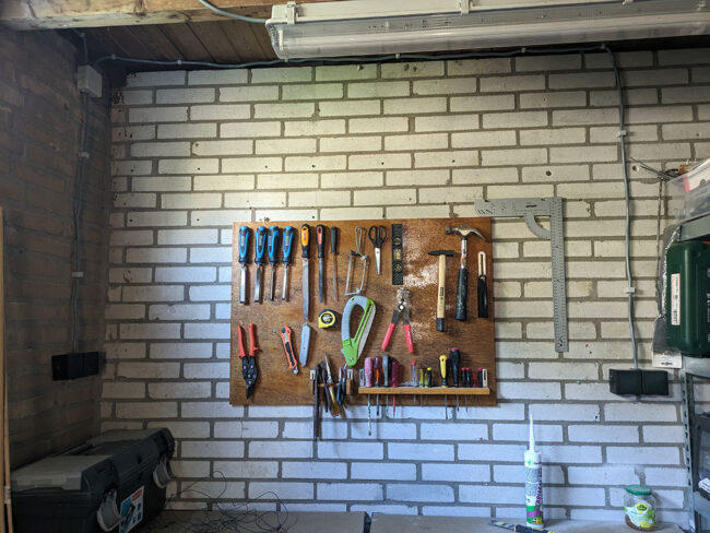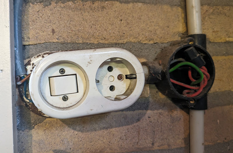 Ik overwoog heel even om een elektricien te vragen. Maar dit kon toch niet zo moeilijk zijn? Er hoefde niets met een stoppenkast ofzo te gebeuren, het was alleen een kwestie van opnieuw kabeltjes trekken en schakelmateriaal bevestigen – allemaal opbouw, geen inbouw. En aangezien het in de schuur was, hoefde het ook niet perfect, want het is niet iets waar ik de hele dag naar kijk.