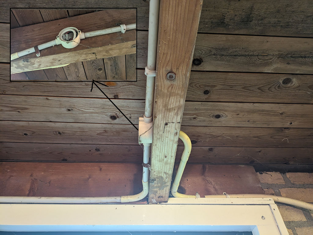 Mijn eerste idee was om een stroomkabel te splitsen en via een gat in de muur van de schuur (dat er al zat vanwege de buitenlamp) naar buiten te leiden. Maar toen ik de elektra in mijn schuur eens goed bekeek, wilde ik niet nog een extra aftakking aan dat rommeltje knutselen. De bekabeling die er al in zat toen ik het huis kocht was oud, de pvc-buizen waar die doorheen waren gevoerd bogen door en hingen half van het plafond, en diverse kabeldoosjes hadden geen dekseltje.