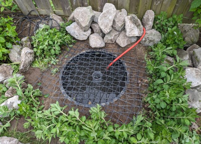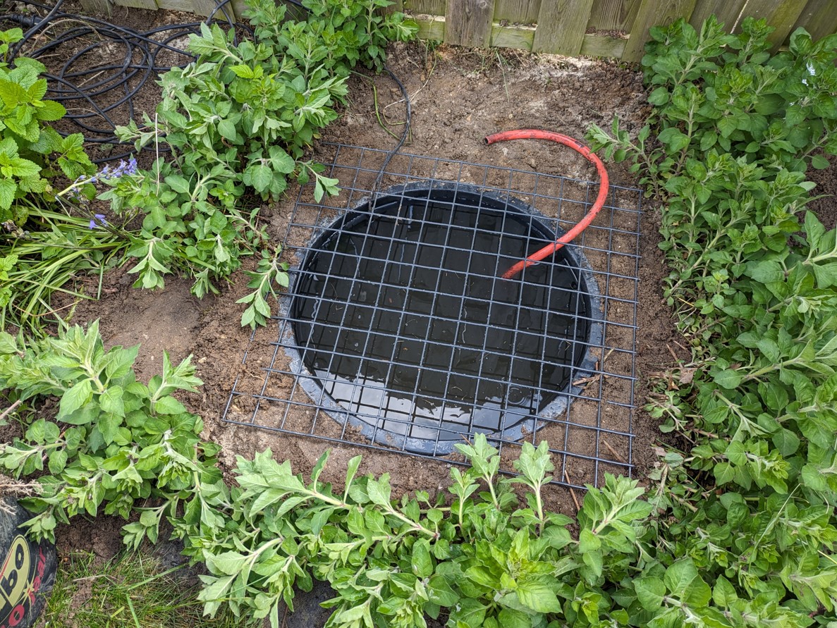 De bak vullen met water uit de regenton, pomp erin doen en afgeknipt stuk van het rooster erover leggen: