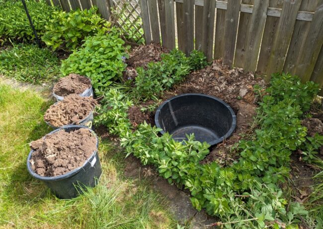Eerst maar eens de planten verwijderen en de speciekuip ingraven in de grond. Ik had verwacht dat dat laatste een zwaar karwei ging worden, maar de grond was redelijk vochtig en de spade ging er makkelijk in.