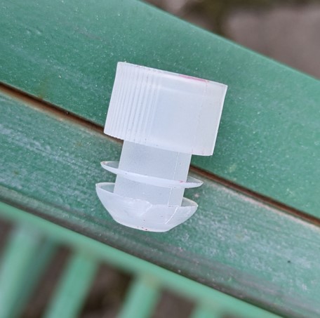 cm in doorsnede, terwijl die van de gargoyle 1 cm doorsnede was. Ik had bij het tuincentrum een verloop-/koppelstukje gehaald, maar dat bleek niet te passen. Zucht. Weer tijd voor een creatieve oplossing dus. Dat was ditmaal het plastic dopje van een soort reageerbuisje, dat bovenin hol is. Door met een stanleymes een millimeter van de onderkant af te snijden, creëerde ik een doorlopende opening waar de grootste slang overheen geschoven kon worden. De kleinste slang kon in de opening in het dekseltje geduwd worden. Ducttape deed de rest (immers: wat is een doe-het-zelf-project zonder ducttape?