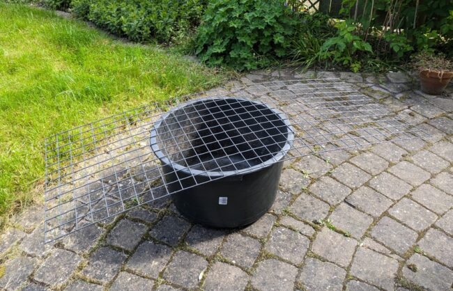 Net als toen ik de waterpartij in mijn vorige huis maakte, schrok ik van de belachelijk hoge bedragen van vijveremmers en gegalvaniseerde roosters. Samen meer dan 100 euro! Mooi niet. Ik had nog een speciekuip in de garage staan die ik kon ingraven, en bij de bouwmarkt kon ik vast een goedkoop hekwerkje halen voor er overheen…