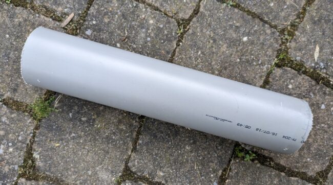 Tijd voor creatieve oplossingen dus. Ik vond een restant pvc-pijp in de garage en zaagde dat af op de diepte van de speciekuip: