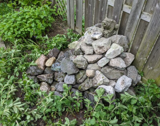 Ik wilde de gargoyle graag op een stapel stenen plaatsen en dan het water naar beneden laten lopen over de stenen. Een vijver hoeft van mij niet – te veel onderhoud en te mug-vriendelijk. Dus ik had alleen een opvangbak voor het water met een rooster erover nodig, die ik kon ingraven in de grond.