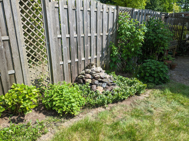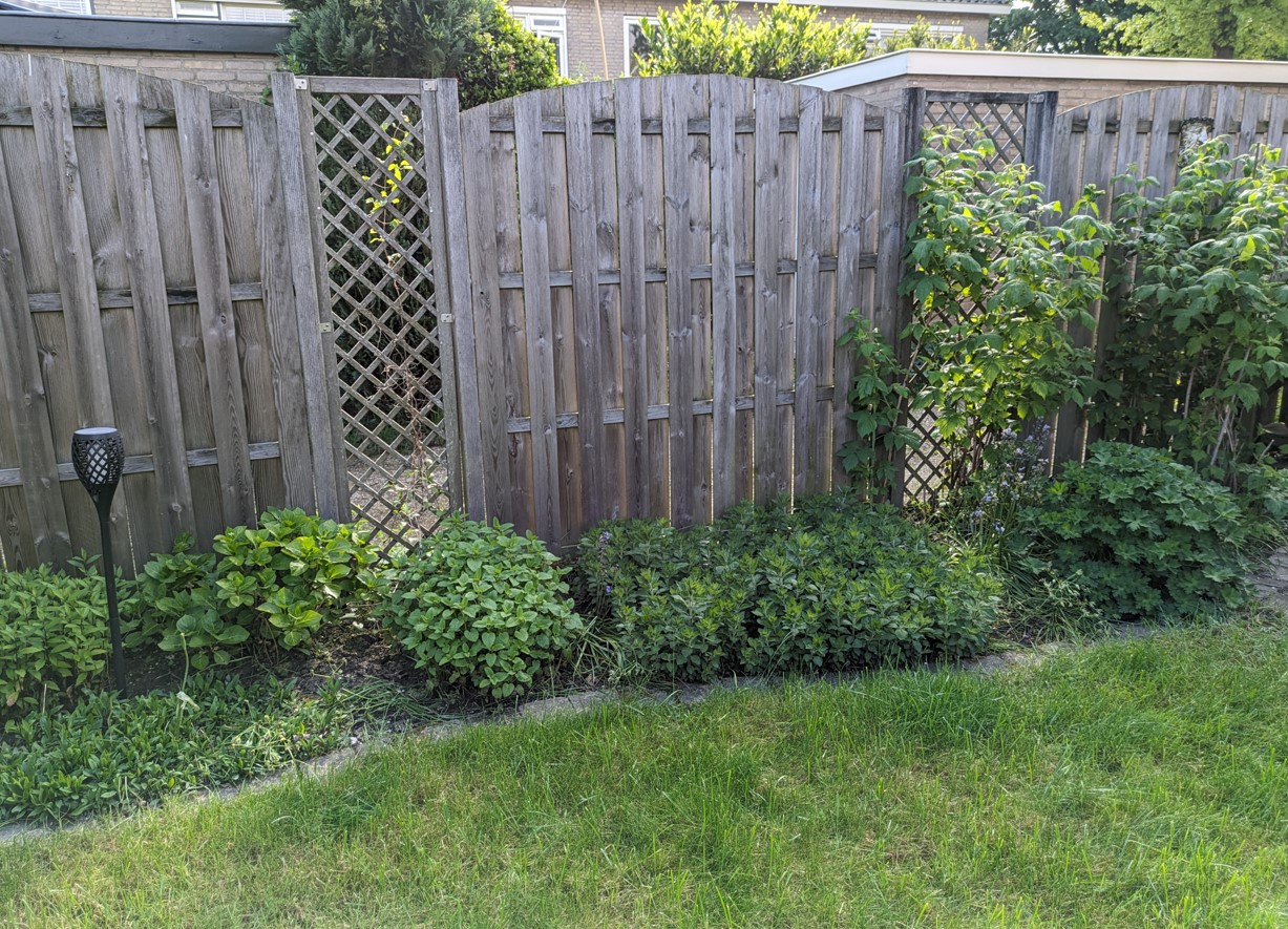 De opnieuw geplante plantjes staan er nog wat zielig bij, maar ik heb ze met wortel en al kunnen terugplanten, en aangezien het van dat spul is dat je hele border overneemt als je niet snel genoeg ingrijpt, komt dat vast snel goed en zie je straks echt niets meer van dat rooster.