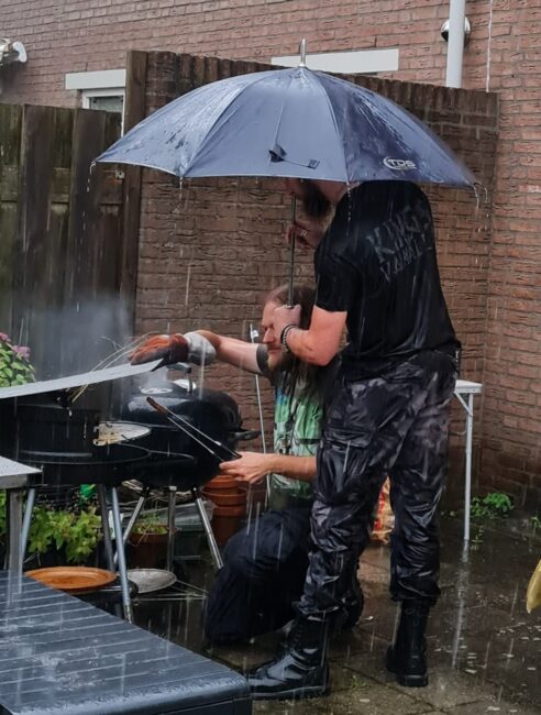 Een probleem? Nee hoor! De meeste vrienden van Richard zijn namelijk ervaren festivalgangers: middeleeuwse festivals, Castlefest, Wacken… allemaal zijn ze niet van suiker en wel wat gewend. Dus werden de schoenen uitgeschopt en werden er dansjes in de regen gedaan. En werd er gewoon doorgebarbecued, al was het onder een paraplu om te zorgen dat de kolen warm bleven! ![]()