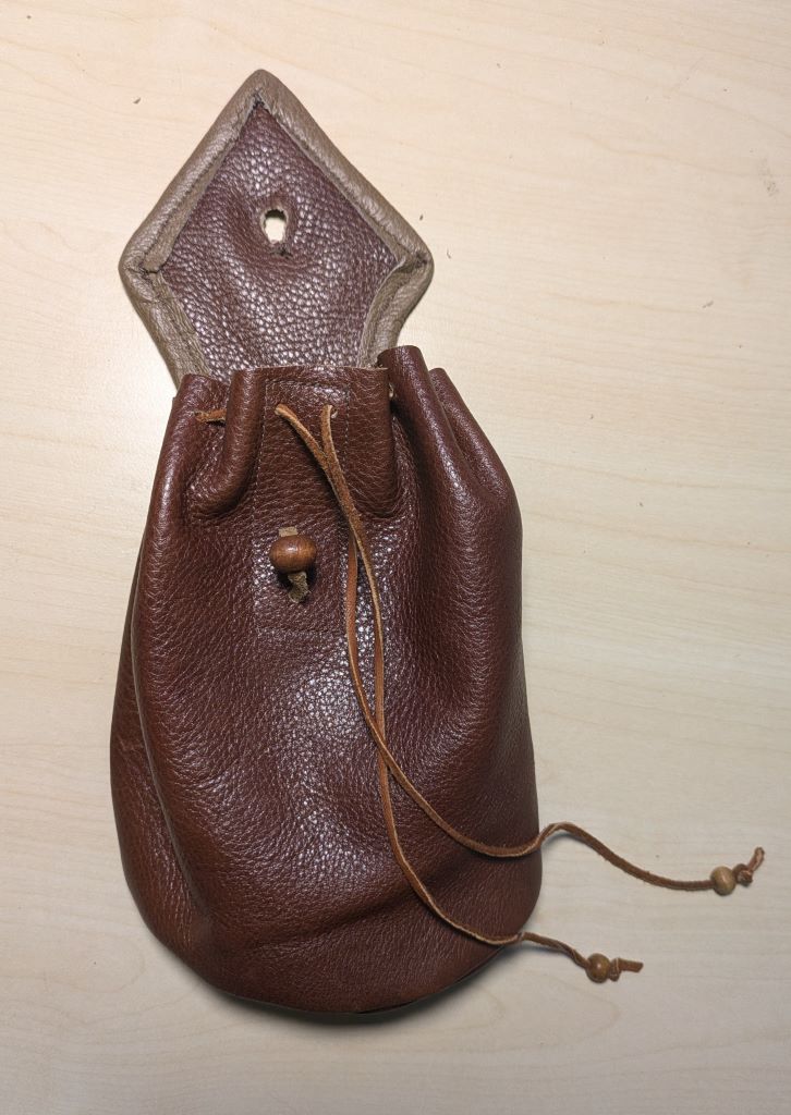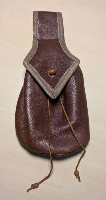 Ik wilde hem graag een zelfgemaakt cadeautje geven. Aangezien we overeenkomstige hobbies hebben, was al snel bepaald wat dat kon zijn. Want ook hij speelt dus in een middeleeuws bandje dat regelmatig wordt gevraagd om op 17e-eeuwse evenementen muziek te komen maken. Voor zover ik wist droeg hij dan zijn middeleeuwse tasje bij zijn outfit. Dus wellicht kon hij nog wel een 17e-eeuws riemtasje gebruiken?