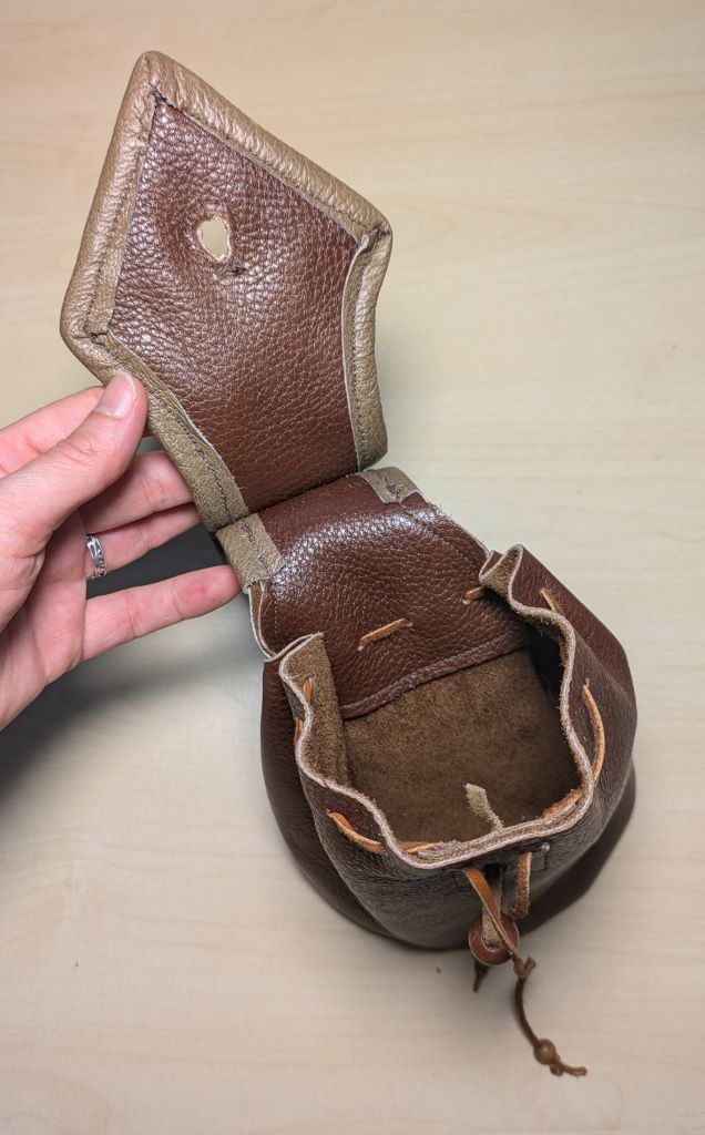 En deze variant heeft een extra finishing touch gekregen, doordat ik de rand van het klepje met een anderkleurig strookje leer heb afgewerkt. Dat was een beetje een gok, want door (meer dan) 4 lagen leer naaien is een behoorlijke uitdaging voor mijn naaimachine. Maar het heeft gelukkig redelijk okee uitgepakt – de naadjes zijn niet superstrak, maar de minst mooie stukjes zitten aan de binnenkant.