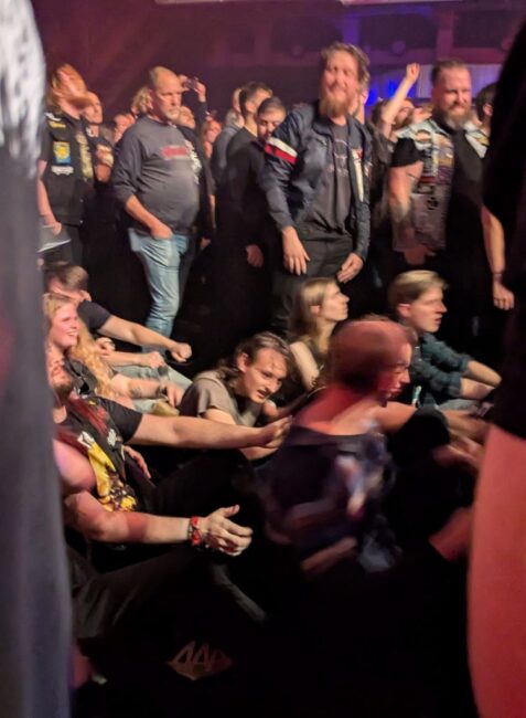 Richard had me als eens ingelicht over wat er gemiddeld genomen bij metalconcerten gebeurt, dus ik was niet verrast toen er een strandbal over het publiek heen zeilde die door de aanwezigen alle kanten op werd gemept. Ook van de ‘rowing pit’ had ik al eens gehoord.