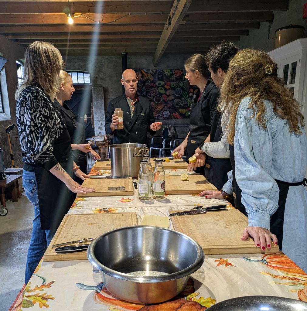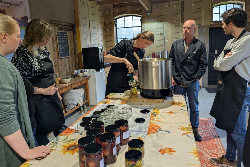 De stoofpeertjes werden gestoofd, de courgette werd in het zuur gelegd en verwarmd, en vervolgens werd alles in potjes gestopt. Die we na afloop uiteraard mee naar huis mochten nemen!