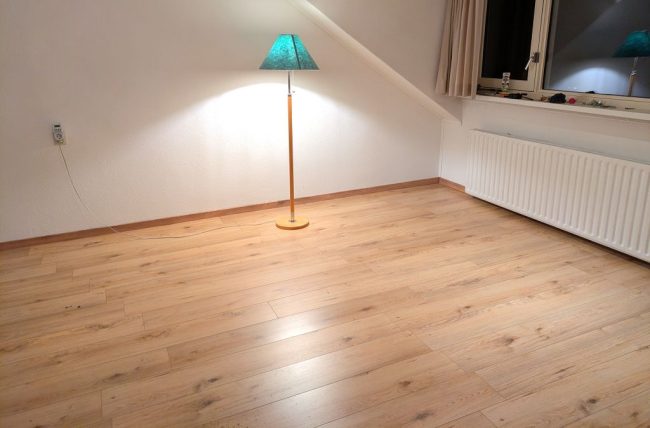 Inmiddels heb ik wel wat ervaring met laminaatleggen, maar toch is het altijd een uitdaging om het netjes te krijgen. Gelukkig heeft mijn zolder weinig moeilijke hoekjes: de hoeken van de kamer lopen (relatief) haaks en de leidingen van de verwarming gaan de muur in in plaats van de vloer, maar wel zitten er twee inbouwkasten in, dus met de gewone deur erbij zijn dat drie deurposten waar je omheen moet zagen.