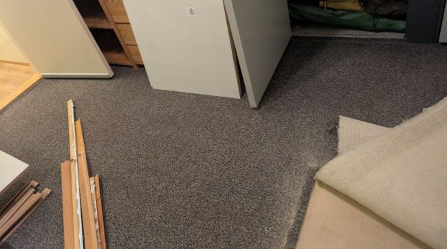 Vergeten voor-foto’s te maken, maar ik was nog net op tijd om de vloerbedekking toch op de kiek te zetten voordat we ‘m er helemaal uit hadden gerost (auw, mijn rug…).
