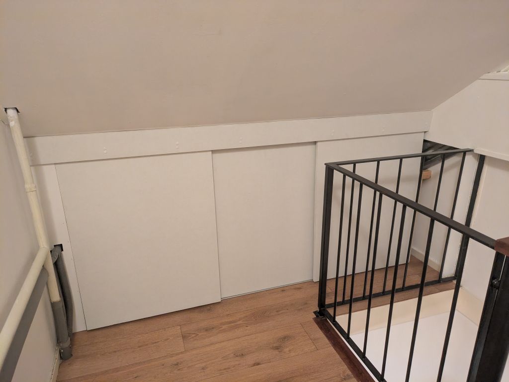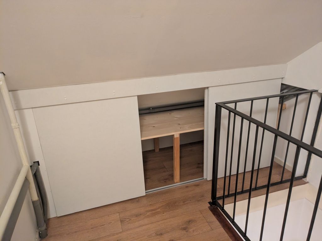Verwarmings- en waterleidingen aan beide zijden én de achterkant dus. Waarbij aan de rechterkant ook nog een soort uitstekend deel aan de wand zit. Dat betekende dus dat we helaas niet een kast neer konden zetten waarbij de deurtjes van wand tot wand liepen: we moesten om al die obstakels heen ontwerpen en werken. En dan had je nog de balustrade, die in de weg zit als je bij de rechterkant van de kast wil kunnen, terwijl we natuurlijk niet op willekeurige plekken iets tegen dat plafond konden schroeven – érgens achter dat plafond lopen een paar houten balken waar we in konden schroeven, de rest was lege ruimte. Dat was dus op zoek gaan naar de naadjes van de plafondplaten en met er tactisch tegen kloppen, achterhalen of daar inderdaad een balk achter zat (fingers crossed).