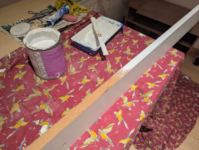 De lelijke gordijntjes die de vorige bewoners gebruikten ter afscherming van de opslagruimte, gebruik ik ironisch genoeg nu als afdekdoek voor verfklussen!